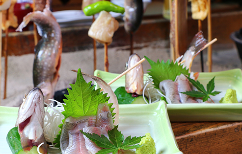 囲炉裏を使った料理「古の平家鷹狩焼」は湯西川に逃れ落ちた平家の末裔が、長年の隠遁生活の中から生み出したお料理です。炭火で焼く川魚(イワナなど)は、遠赤効果で骨まで柔らかく香ばしい味わいです。