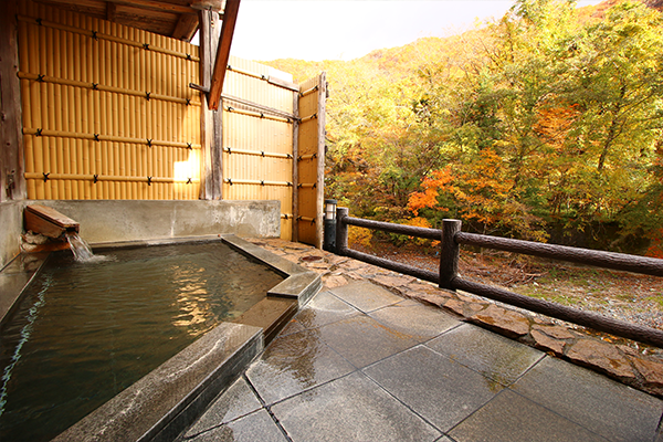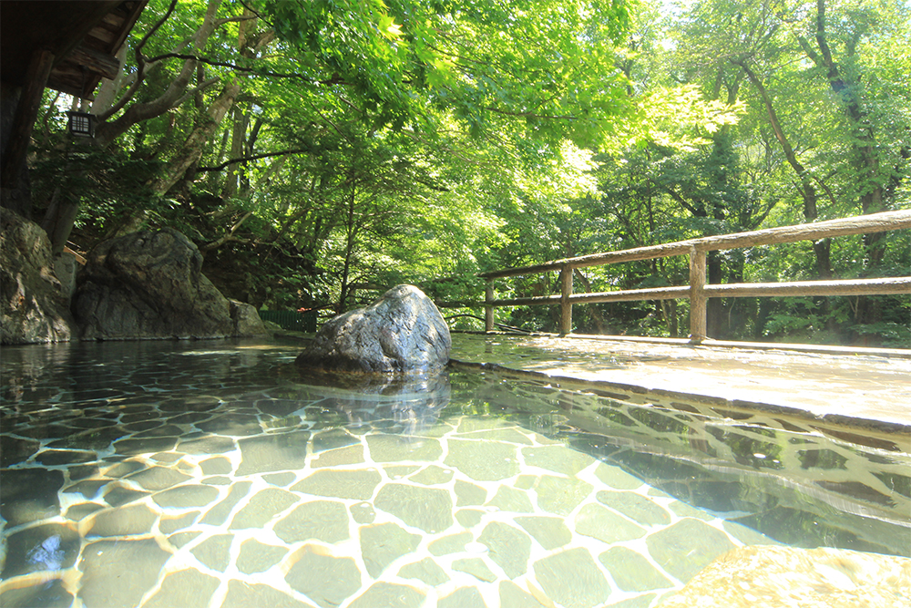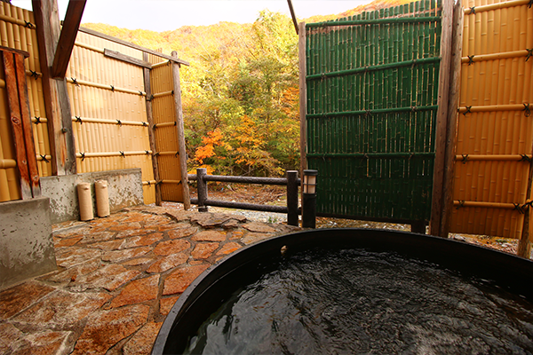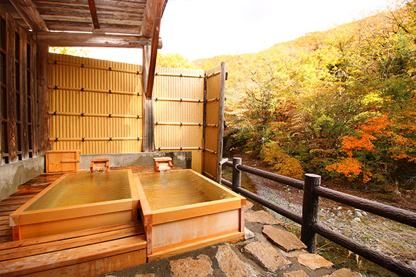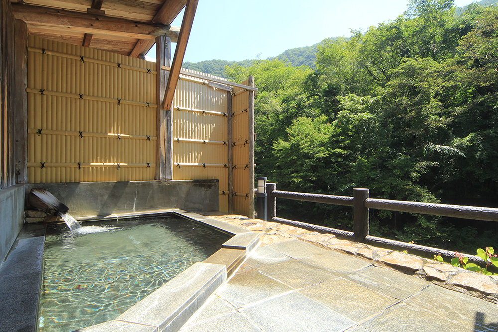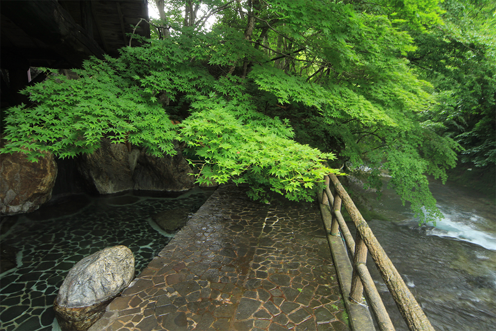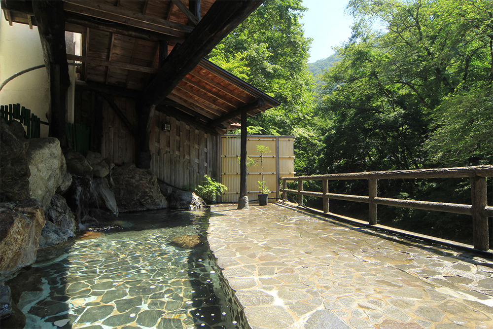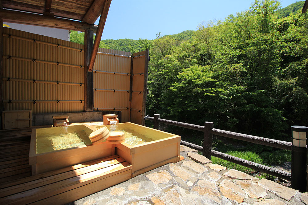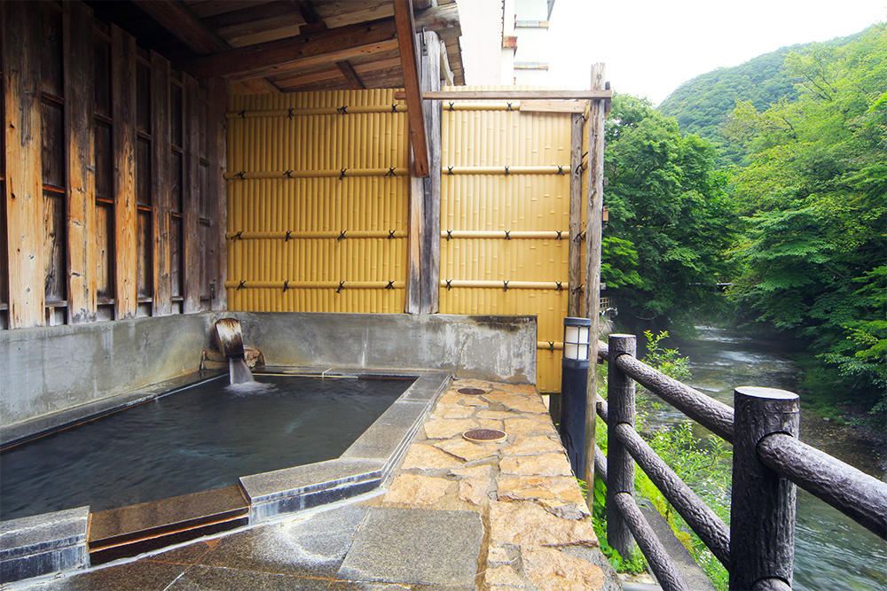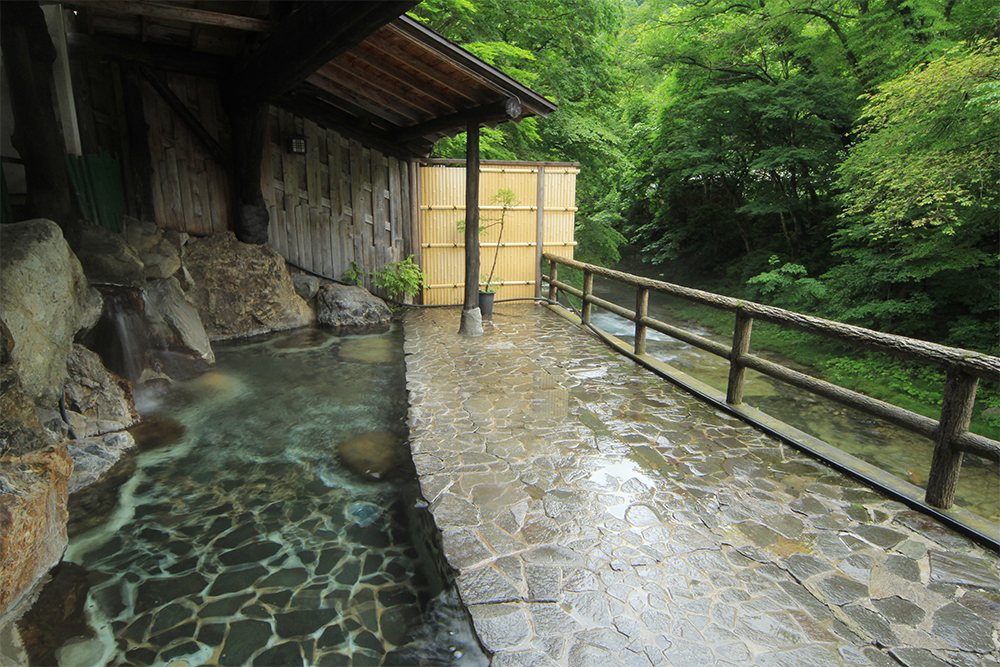 渓流添いの3つの貸切風呂を2つの大露天風呂が並ぶ、湯殿からの眺めは湯西川でも評判の宿です。