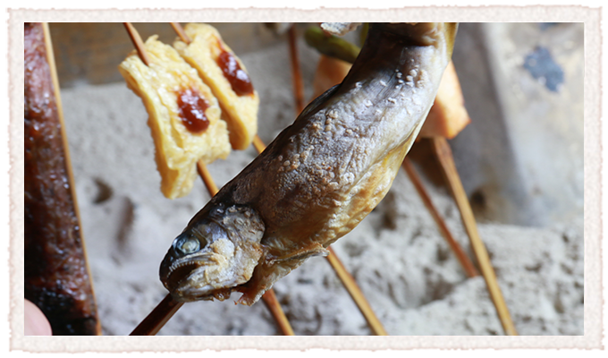 囲炉裏串は湯葉、鶏肉、もち、岩魚、一升ベラが基本でお料理コースに付きます。