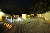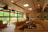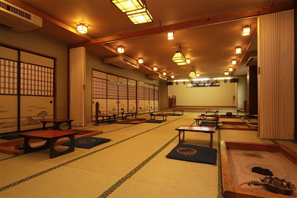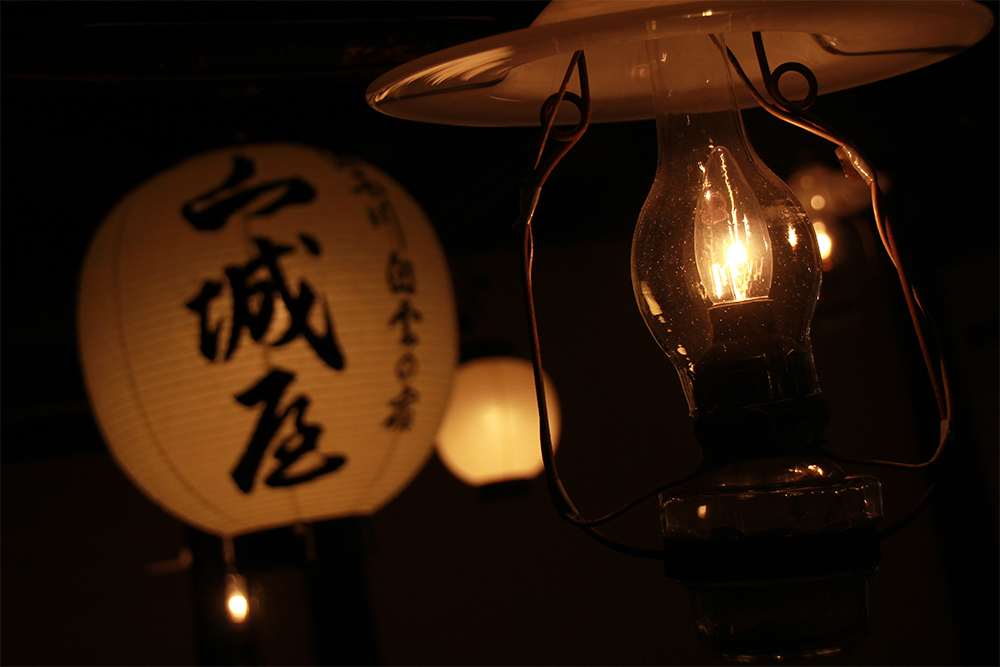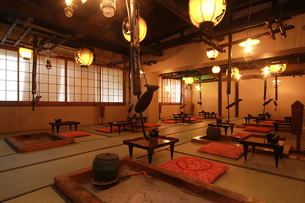 天井から下がる提灯とランプの明かりがほんのりと揺らめき 囲炉裏の炎が食事を美味しく彩ります。